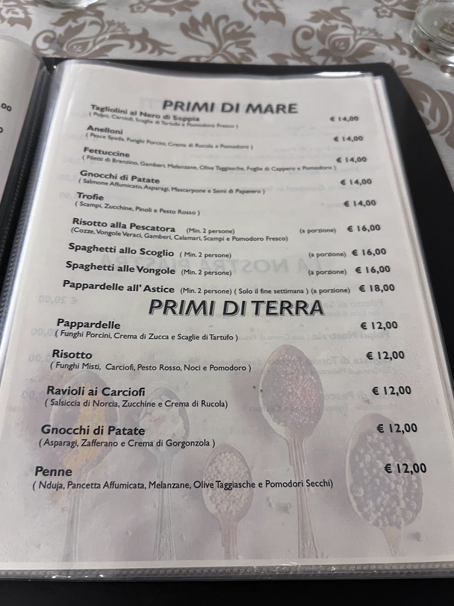 The antipasti selection offers a range of options including mixed seafood starters, land-based platters, and crostini. First courses highlight classic pasta dishes such as spaghetti with clams, seafood pasta, gnocchi, and more complex preparations like pappardelle with lobster and timballo with rice, salmon, and burrata.