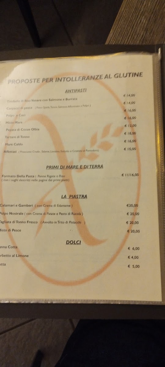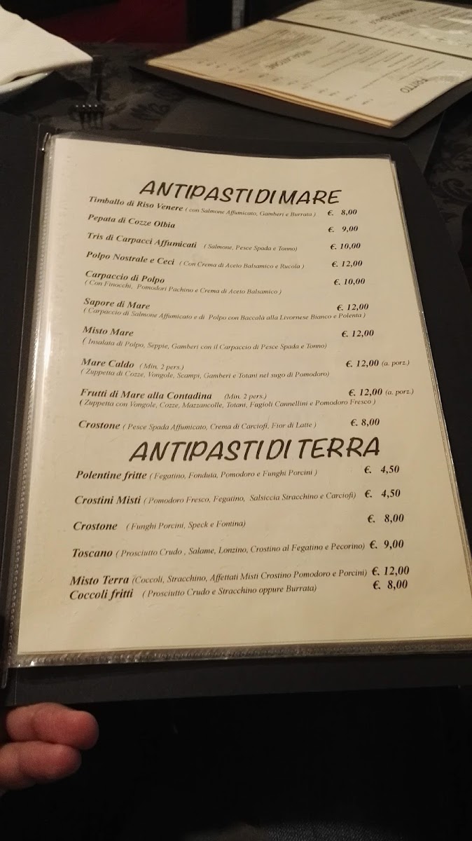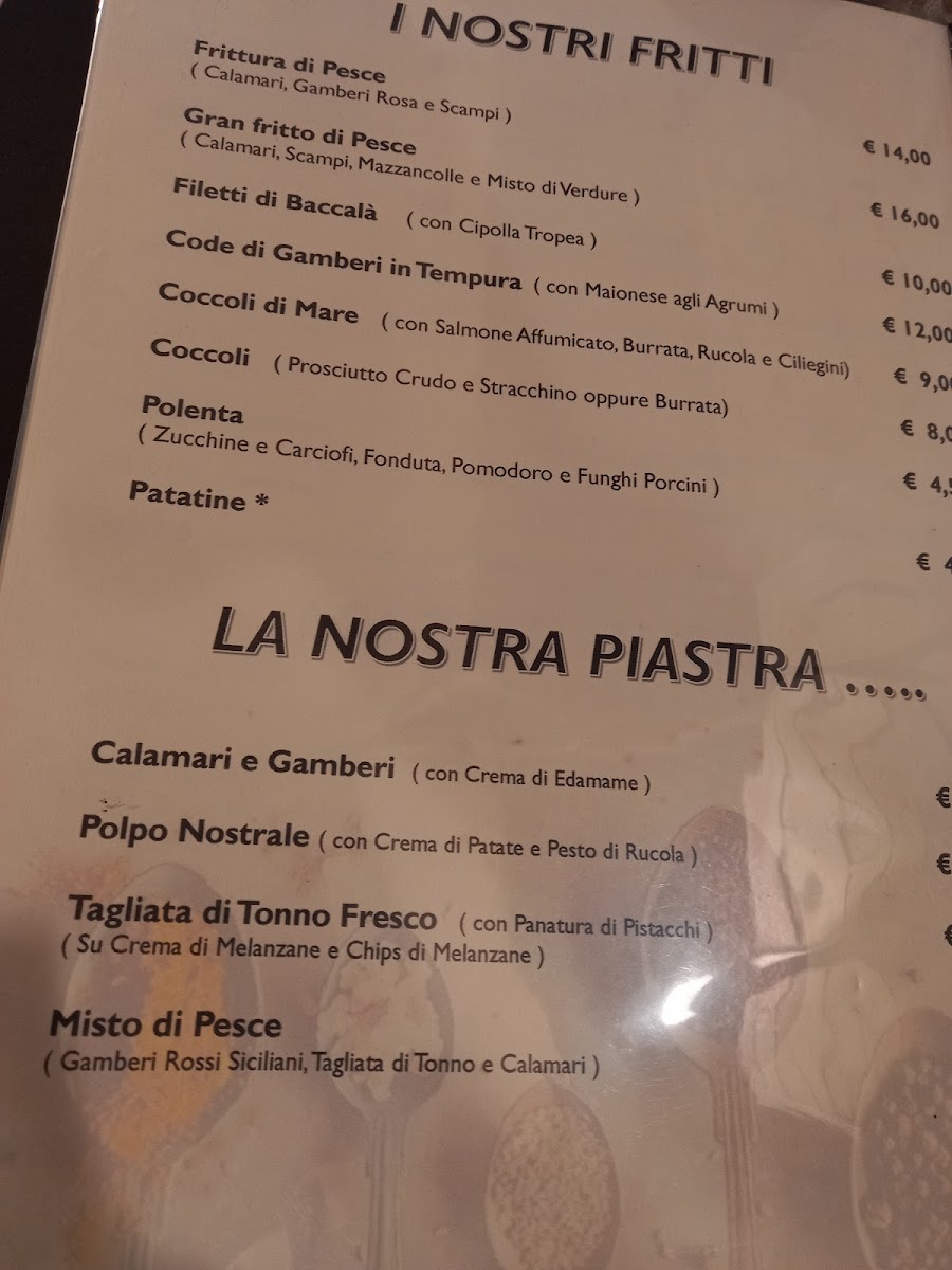 The menu features a variety of traditional and contemporary Italian dishes with a strong emphasis on pizza and seafood. It is organized into categories that include antipasti, primi piatti (first courses), pizzas, and desserts.