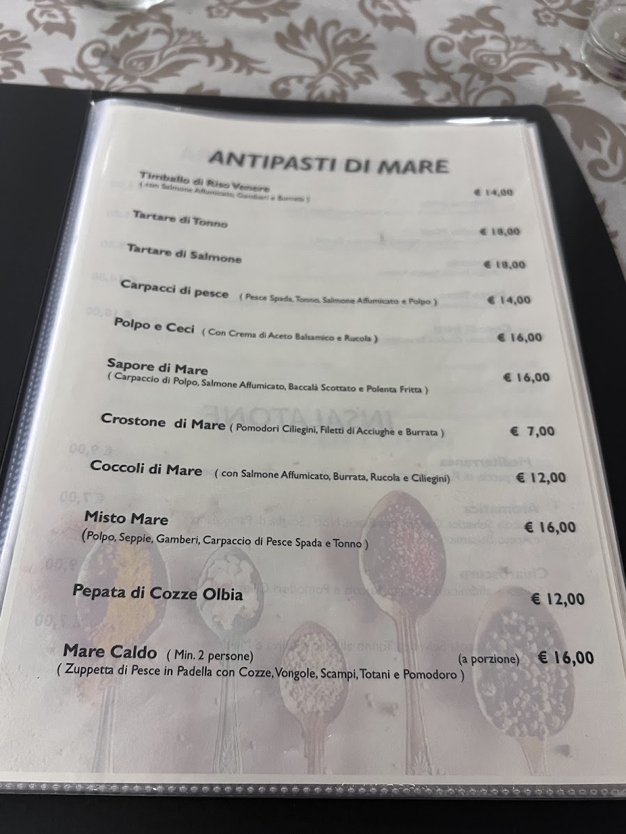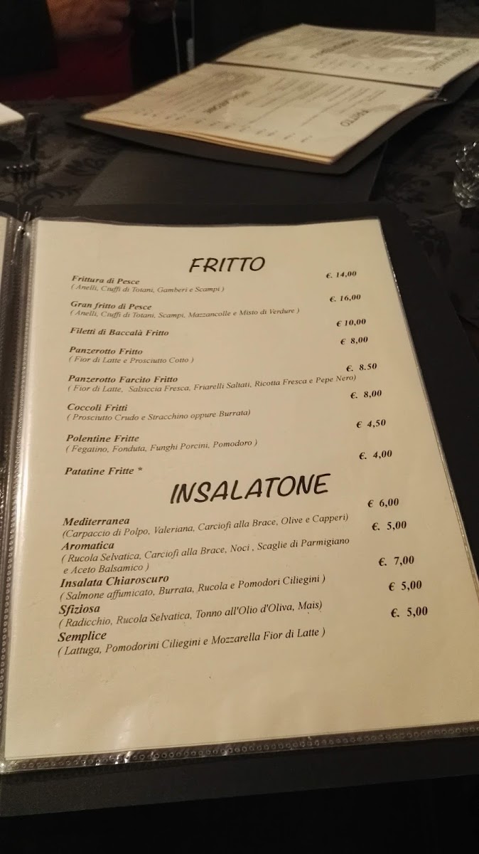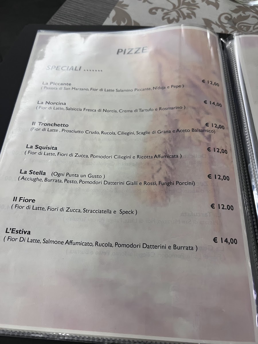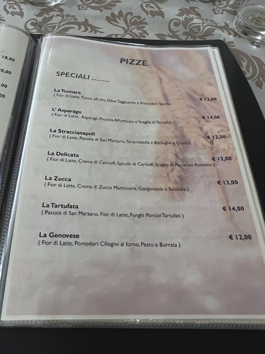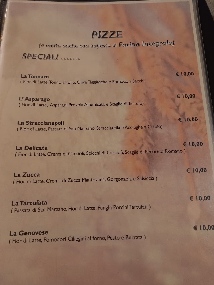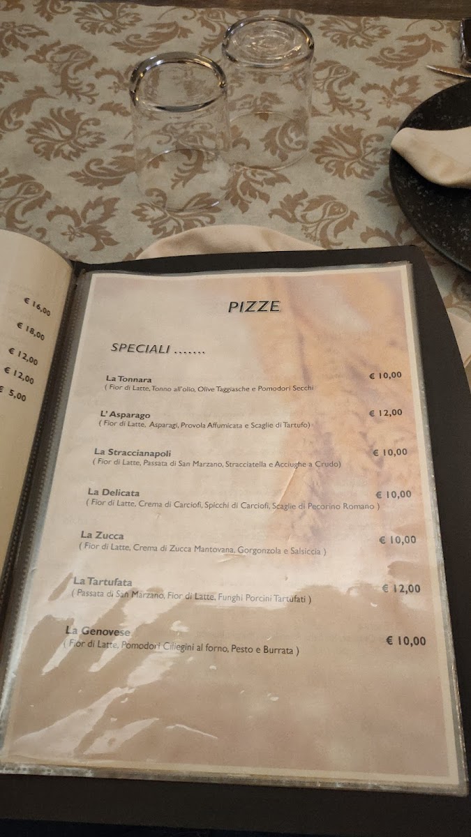 This menu is appropriate for casual dining occasions ranging from light meals and lunch to dinner. The variety of dishes allows for quick orders of pizzas or more elaborate multi-course meals featuring antipasti and primi piatti.